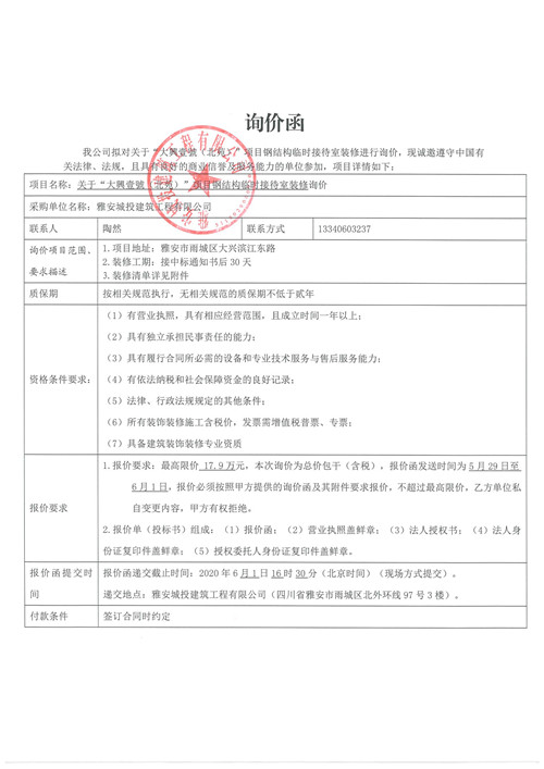 城投建工公司“大興壹號(hào)(北苑)”項(xiàng)目鋼結(jié)構(gòu) 臨時(shí)接待室裝修的詢(xún)價(jià)函