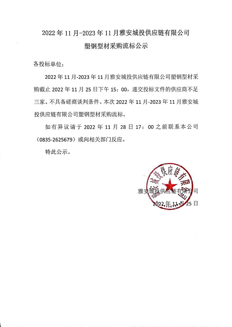 2022年11月-2023年11月雅安城投供應鏈有限公司塑鋼型材采購流標公示
