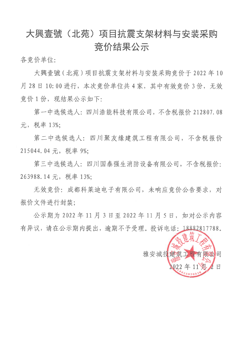大興壹號(hào)(北苑)項(xiàng)目抗震支架材料與安裝采購(gòu)競(jìng)價(jià)結(jié)果公示