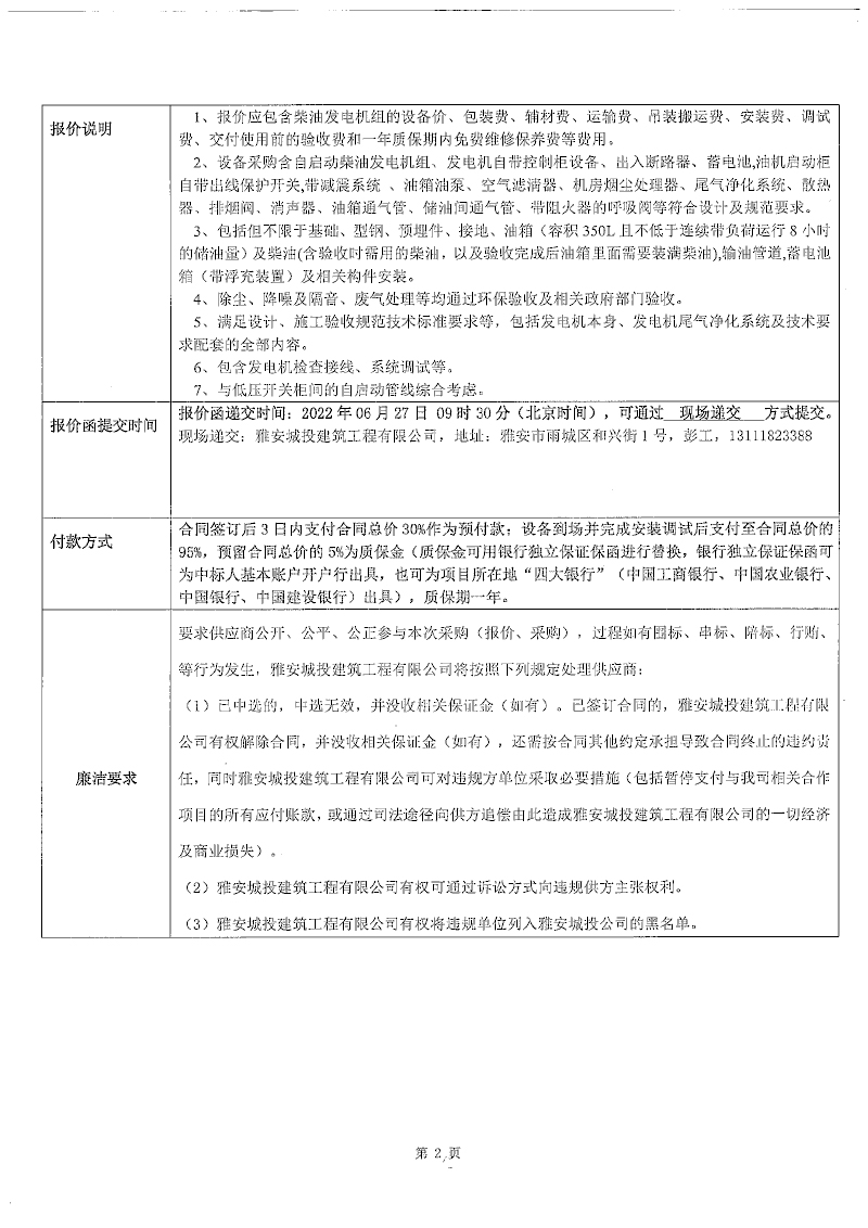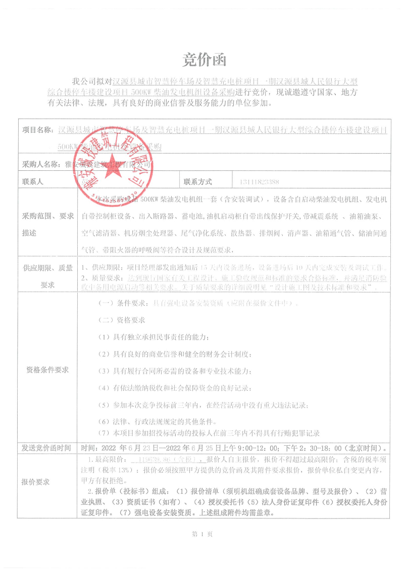 漢源縣城市智慧停車場及智慧充電樁項目一期漢源縣城人民銀行大型綜合樓停車樓建設項目500kw柴油發(fā)電機組設備采購競價公告