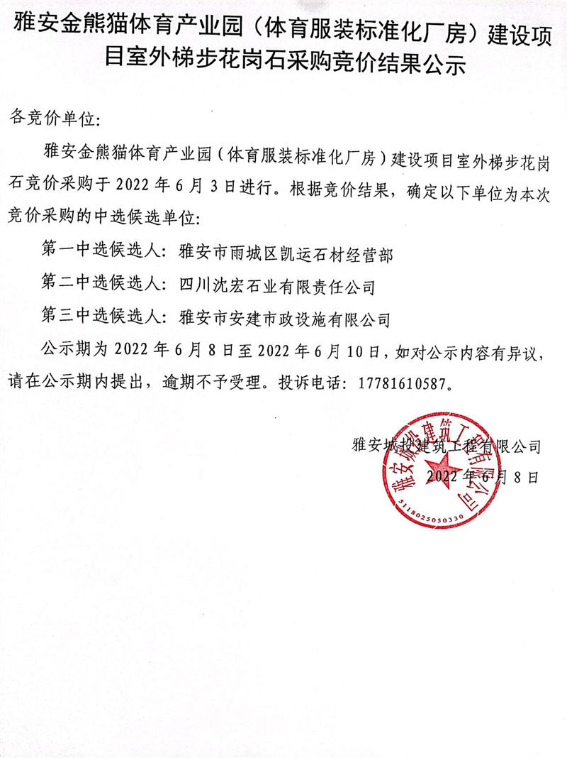 雅安市金熊貓?bào)w育產(chǎn)業(yè)園標(biāo)準(zhǔn)化廠房項(xiàng)目室外梯步花崗石采購競(jìng)價(jià)結(jié)果公示