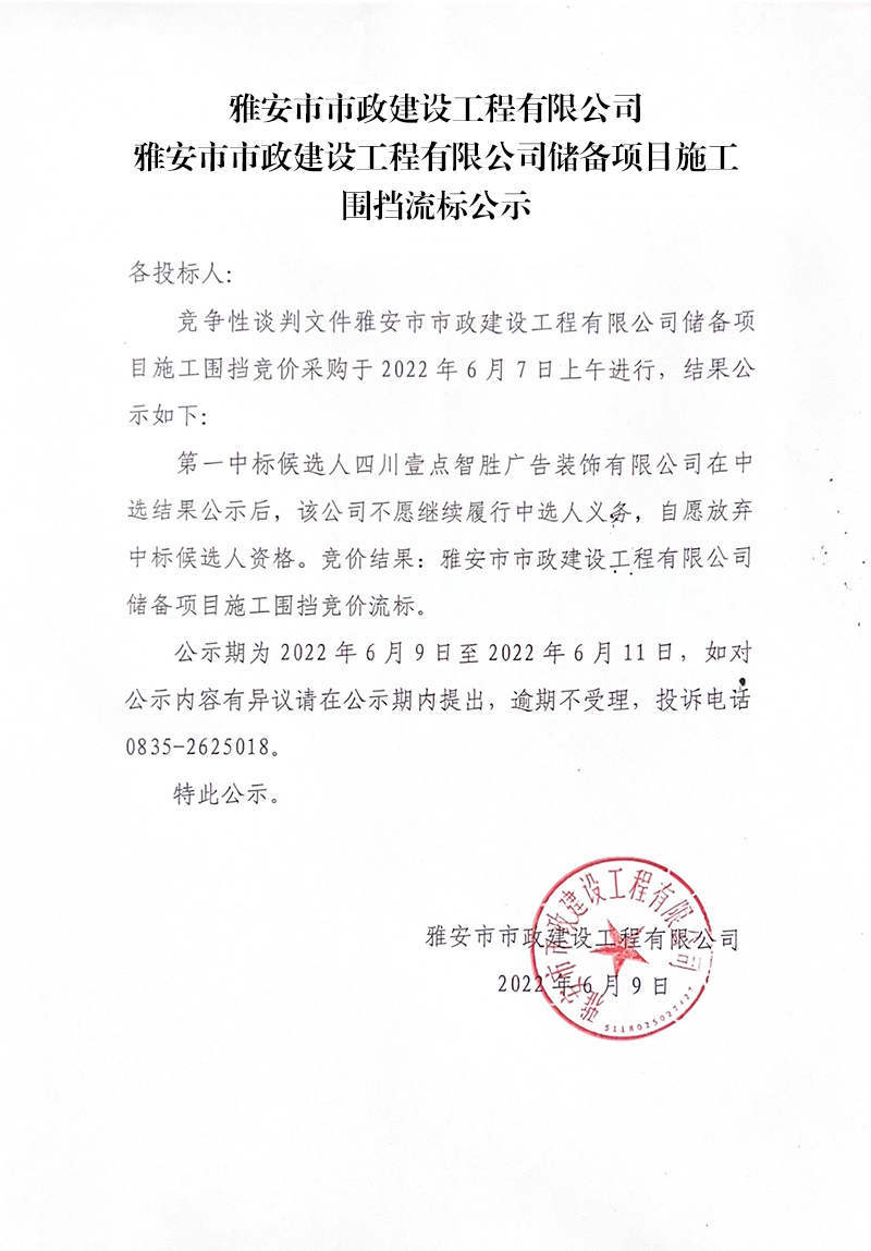 雅安市市政建設工程有限公司儲備項目施工圍擋流標公示