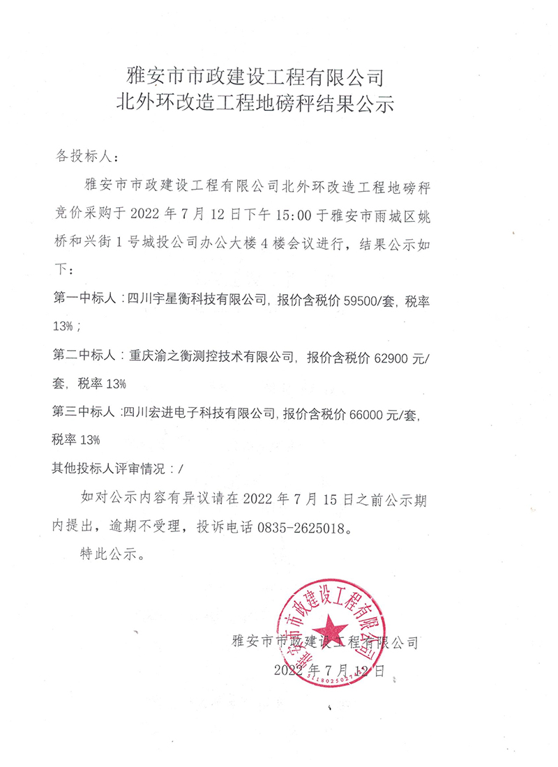 雅安市北外環(huán)改造工程地磅秤詢價結(jié)果公示