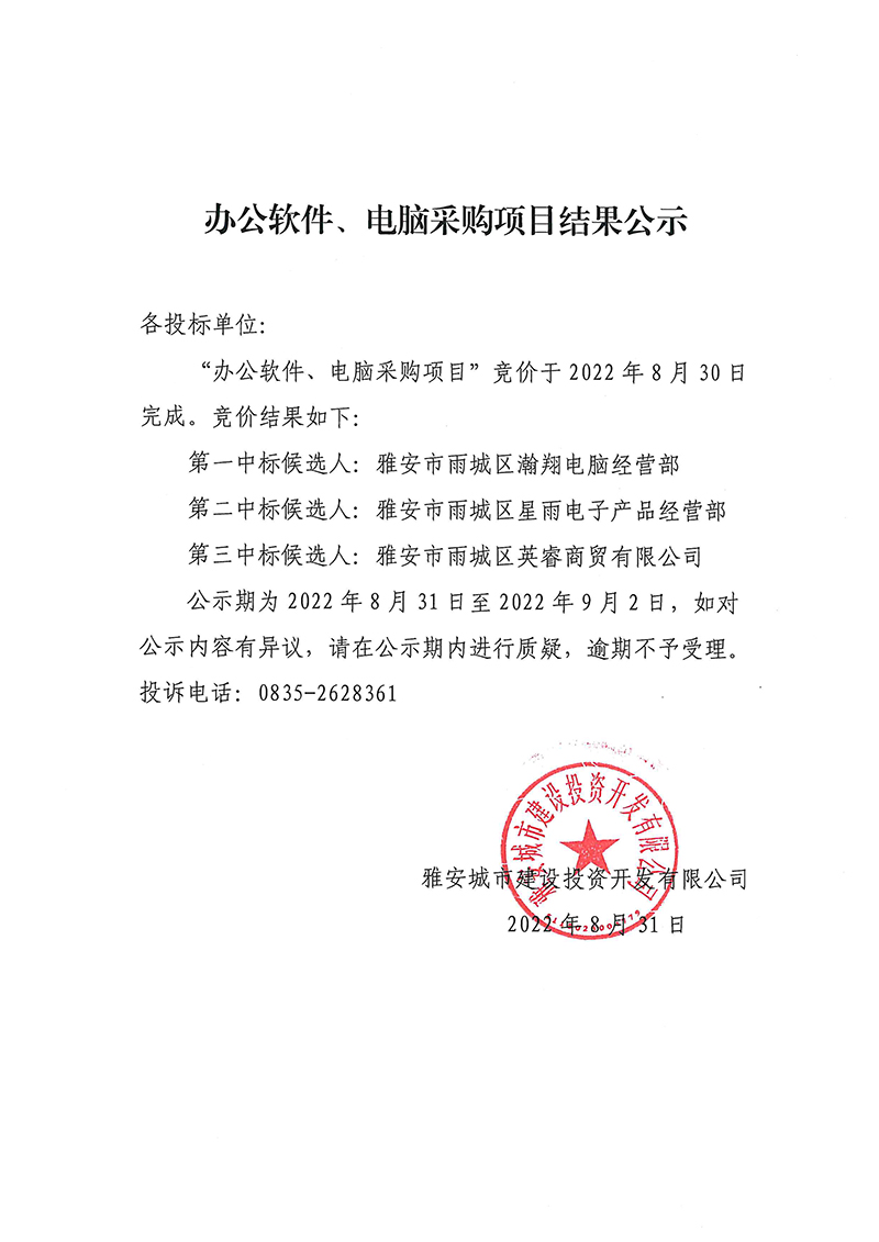 雅安城市建設(shè)投資開(kāi)發(fā)有限公司辦公軟件、電腦采購(gòu)項(xiàng)目結(jié)果公示