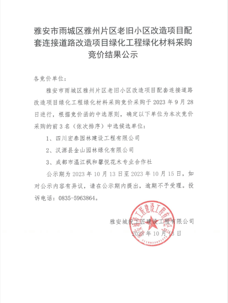 雅安市雨城區(qū)雅州片區(qū)老舊小區(qū)改造項(xiàng)目配套連接道路改造項(xiàng)目綠化工程綠化材料采購(gòu)競(jìng)價(jià)結(jié)果公示