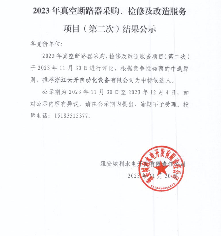 2023年真空斷路器采購(gòu)、檢修及改造服務(wù)項(xiàng)目(第二次)結(jié)果公示