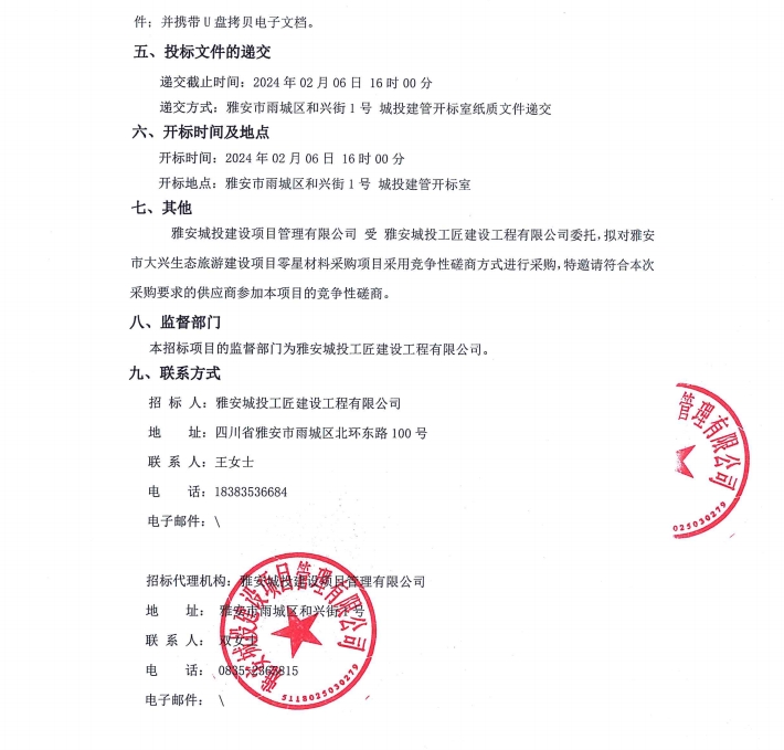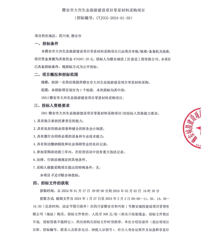 雅安市大興生態(tài)旅游建設項目零星材料采購項目公告