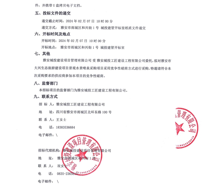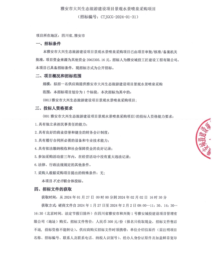 雅安市大興生態(tài)旅游建設項目景觀水景噴泉采購項目公告