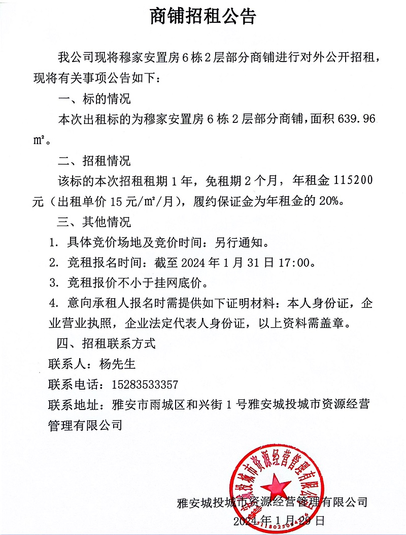 穆家安置房6棟2層部分商鋪招租公告