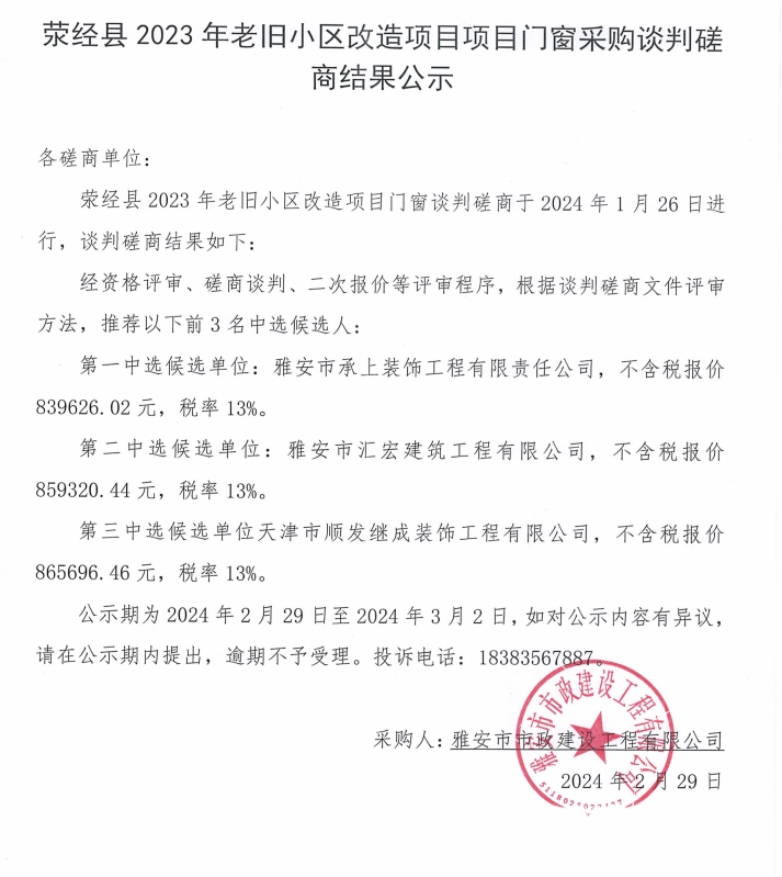 滎經(jīng)縣2023年老舊小區(qū)改造項(xiàng)目門(mén)窗采購(gòu)采購(gòu)談判磋商結(jié)果公示