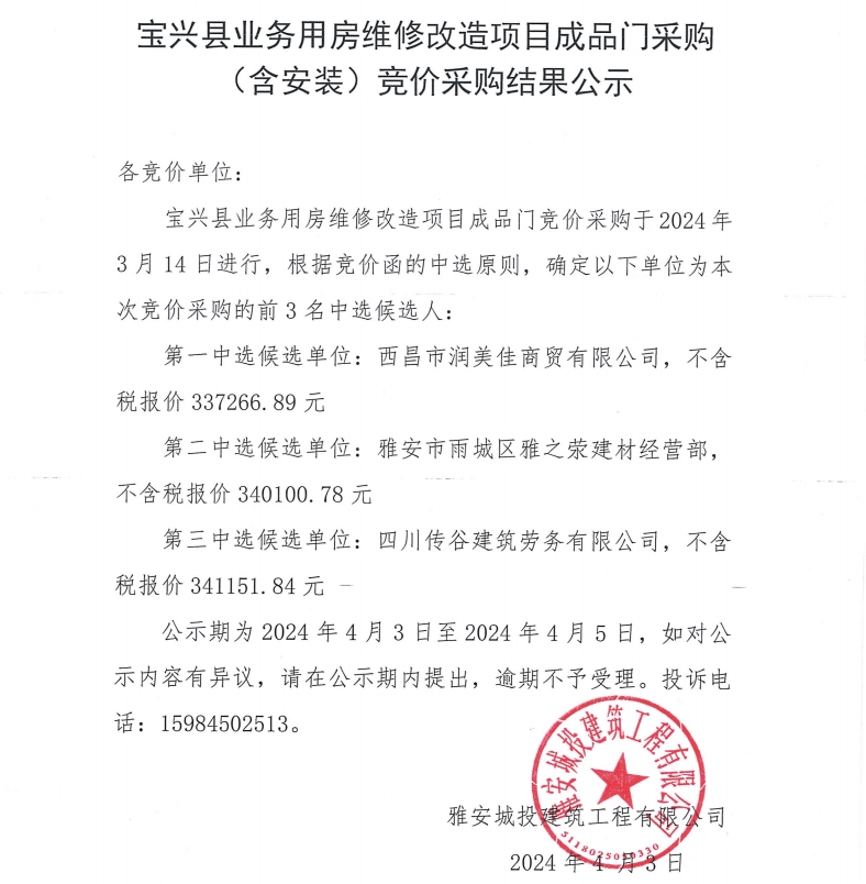 寶興縣業(yè)務(wù)用房維修改造項目成品門采購(含安裝)競價采購結(jié)果公示