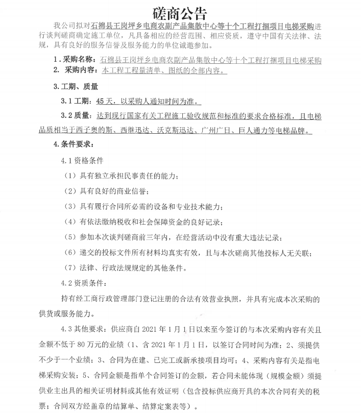 石棉縣王崗坪鄉(xiāng)電商農副產品集散中心等十個工程打捆項目電梯采購磋商公告