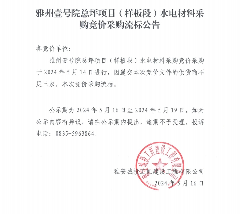 雅州壹號院總坪項目(樣板段)水電材料采購競價采購流標(biāo)公告