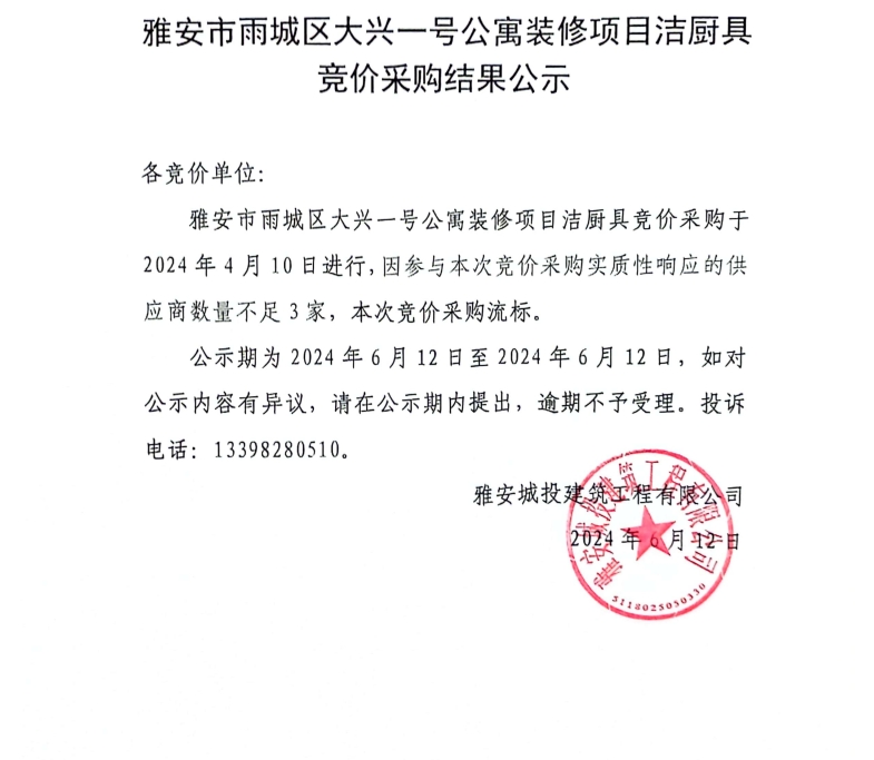 雅安市雨城區(qū)大興壹號(hào)公寓裝修項(xiàng)目潔廚具競(jìng)價(jià)采購(gòu)結(jié)果公示
