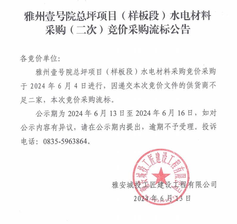 雅州壹號院總坪項目(樣板段)水電材料采購(二次)競價采購流標公告