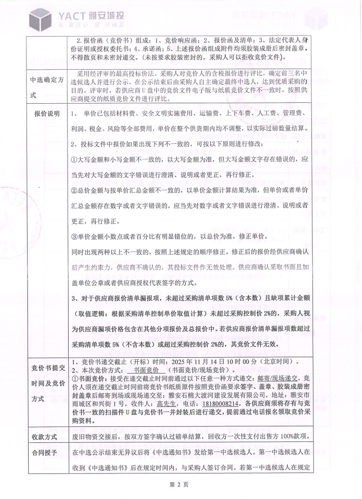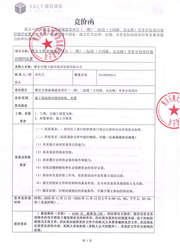 雅安文教新城建設項目(一期)二標段(大同路、眾友路)勞務分包項目廢舊圍擋處置競價公告
