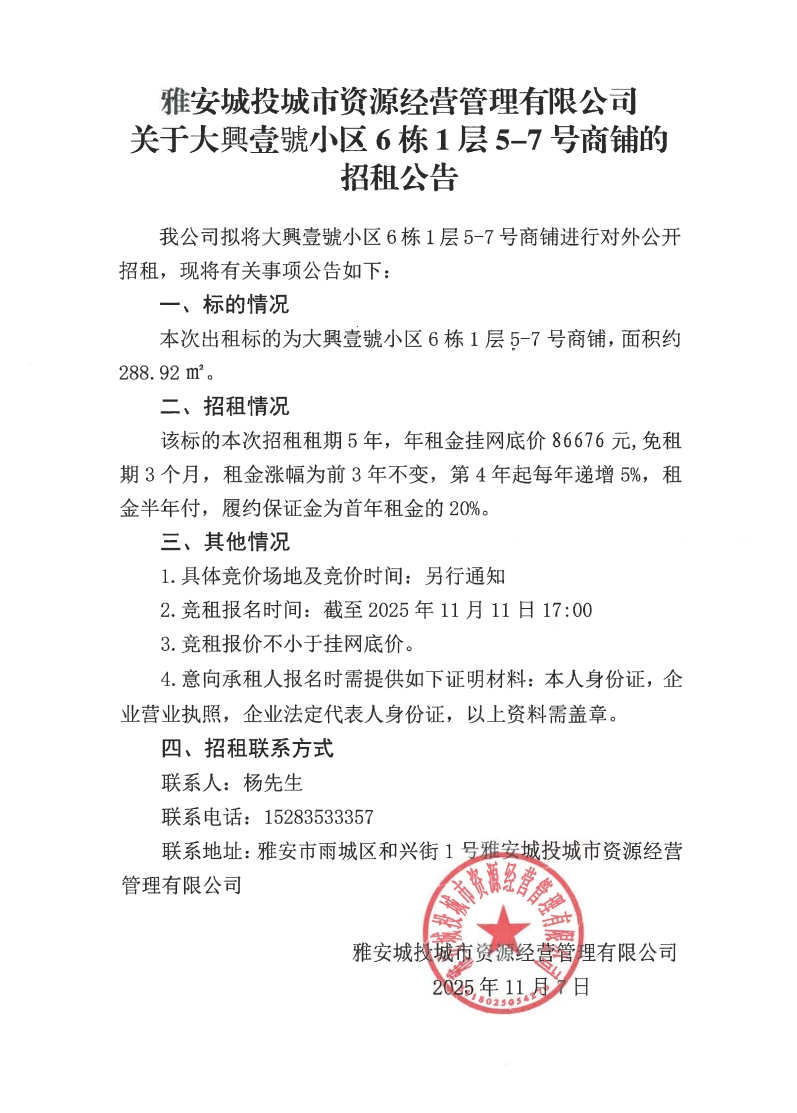 雅安城投城市資源經營管理有限公司關于大興壹號小區(qū)6棟1層5-7號商鋪的招租公告