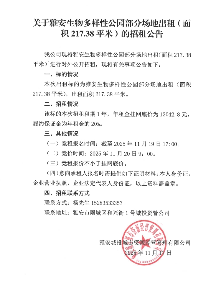 關(guān)于雅安生物多樣性公園部分場(chǎng)地出租(面積217.38平米)的招租公告
