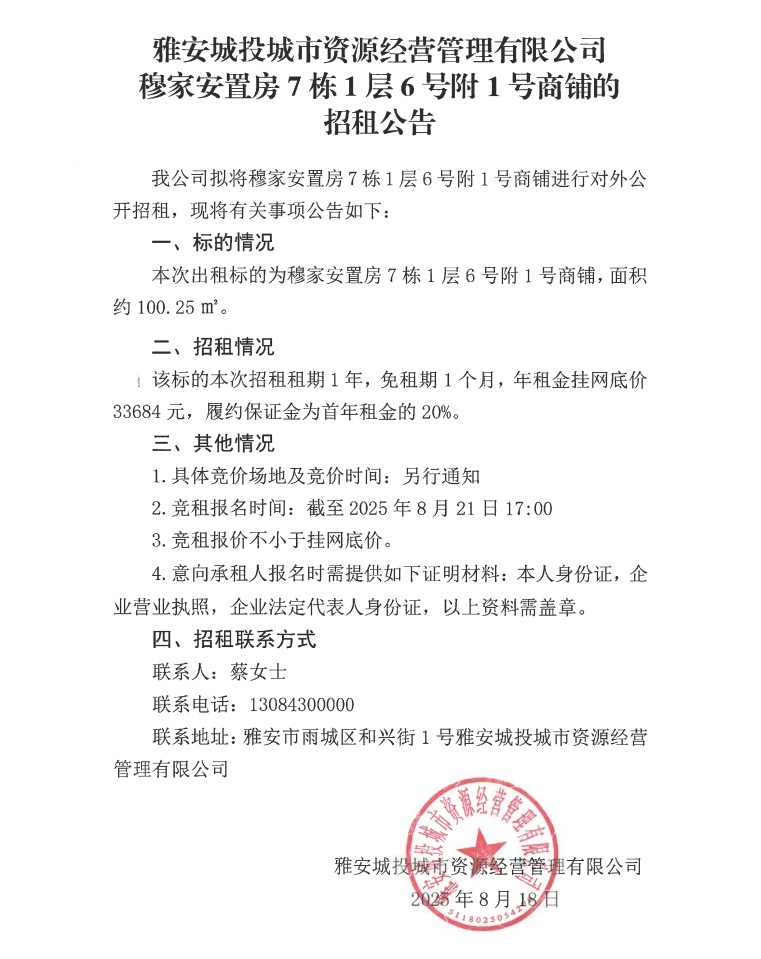 雅安城投城市資源經(jīng)營(yíng)管理有限公司穆家安置房7棟1層6號(hào)附1號(hào)商鋪的招租公告