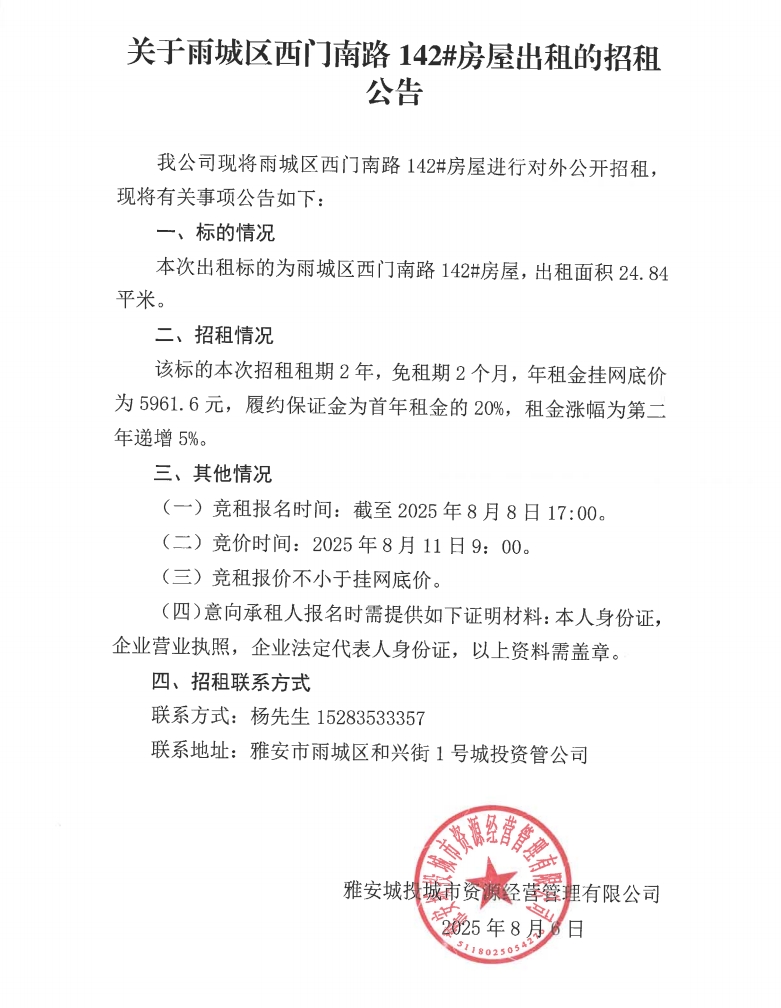 關于雨城區(qū)西門南路142#房屋出租的招租公告